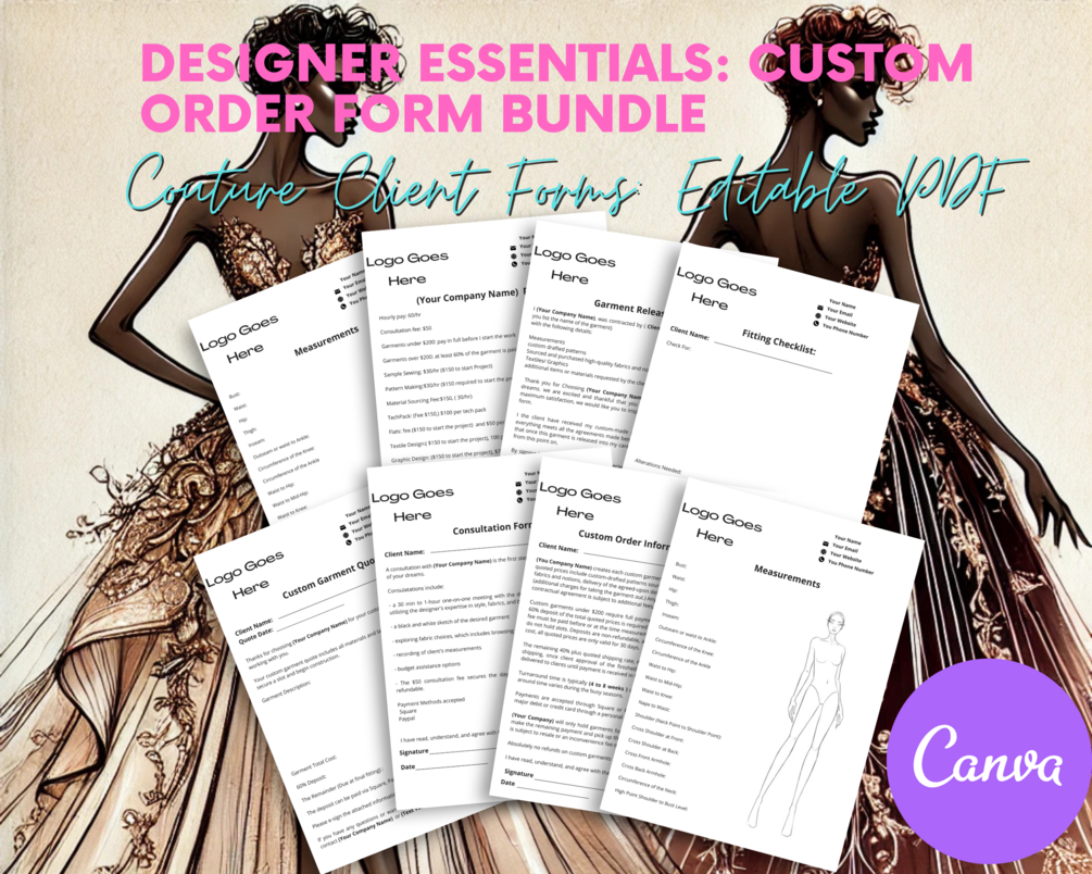 Streamline your design business with this Editable Custom Order Form Bundle, thoughtfully crafted for fashion designers, seamstresses, and small tailoring businesses. This comprehensive set of forms makes it easy to manage consultations, measurements, and client orders, providing a polished, professional experience for your customers.